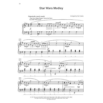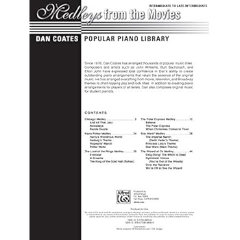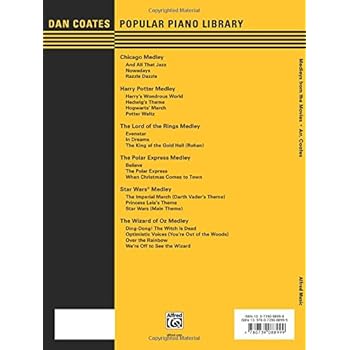 Each edition of the Dan Coates Popular Piano Library contains appropriately leveled arrangements, phrasing, pedaling, and fingering. Students and teachers can enjoy and explore the motivating world of popular music together while reinforcing concepts learned in their lessons. Titles: Chicago Medley (And All That Jazz/Nowadays/Razzle Dazzle) * Harry Potter Medley (Harry's Wondrous World/Hedwig's Theme/Hogwarts' March/Potter Waltz) * The Lord of the Rings Medley (Evenstar/In Dreams/The King of the Gold Hall (Rohan)) * The Polar Express Medley (Believe/The Polar Express/When Christmas Comes to Town) * Star Wars(R) Medley (The Imperial March (Darth Vader's Theme)/Princess Leia's Theme/Star Wars (Main Theme)) * The Wizard of Oz Medley (Ding-Dong! The Witch Is Dead/Optimistic Voices (You're Out of the Woods)/Over the Rainbow/We're Off to See the Wizard).