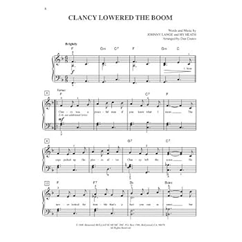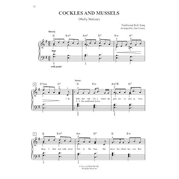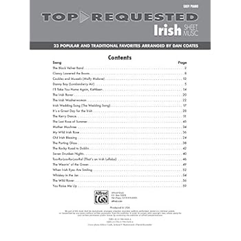 This easy piano collection is perfect for every Irish celebration, from St. Patrick's Day parties to weddings, and more. From nostalgic ballads to raucous pub sing-along favorites, these songs are d to entertain today's audiences. Notably easier to play than standard piano/vocal sheet music, these arrangements by acclaimed piano arranger Dan Coates sound great either as piano solos or to accompany sing-alongs. Complete lyrics and chord symbols are included. Titles: The Black Velvet Band Clancy Lowered the Boom Cockles and Mussels (Molly Malone) Danny Boy (Londonderry Air) I'll Take You Home Again, Kathleen The Irish Rover The Irish Washerwoman Irish Wedding Song (The Wedding Song) It's a Great Day for the Irish The Kerry Dance The Last Rose of SummerMother Machree My Wild Irish Rose Old Irish Blessing The Parting Glass The Rocky Road to DublinSeven Drunken Nights Too-Ra-Loo-Ra-Loo-Ral (That's an Irish Lullaby) The Wearin' of the GreenWhen Irish Eyes Are